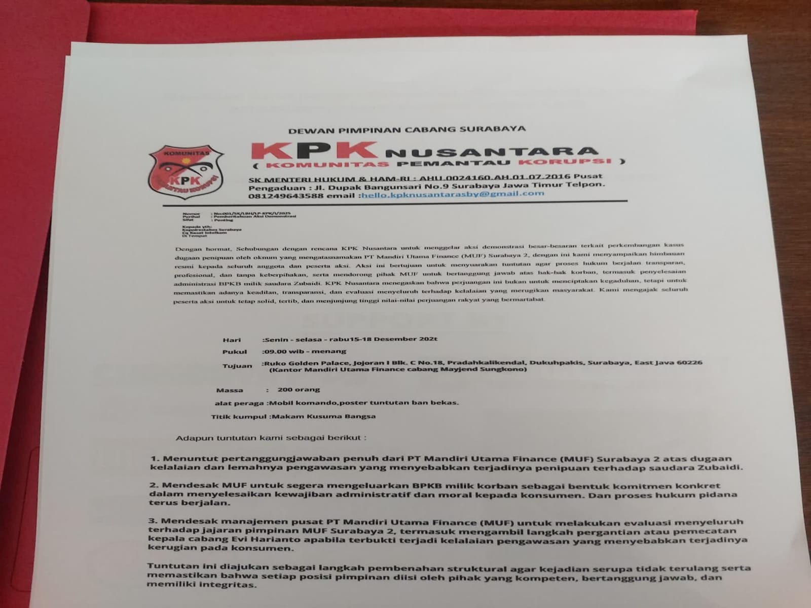 KPK Nusantara melalui perwakilannya, Suhaili, secara resmi melayangkan surat pemberitahuan aksi kepada Kasat Intelkam Polrestabes Surabaya. Surat tersebut berisi pemberitahuan rencana aksi demonstrasi besar-besaran di kantor MUF Surabaya 2 senin (15/12).