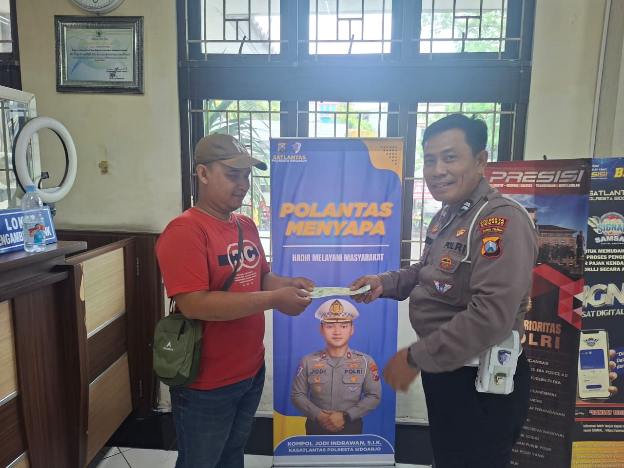 personel yang bertugas di pelayanan Samsat Sidoarjo Kota menyampaikan bahwa program Polantas Menyapa merupakan wujud nyata dari komitmen Polri dalam memberikan pelayanan yang profesional, humanis, dan transparan kepada masyarakat.