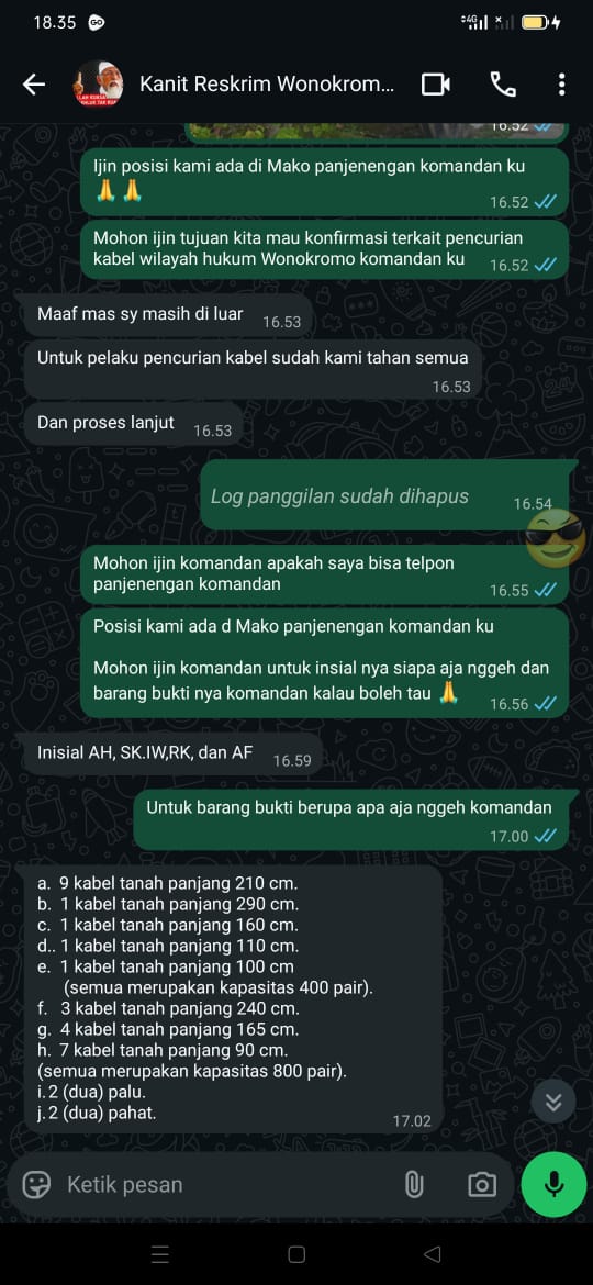 Lebih lanjut IPTU Wasito juga merinci barang bukti yang berhasil diamankan dalam perkara tersebut. Barang bukti yang sebelumnya disebut βtidak adaβ kini diungkap secara detail terdiri dari sejumlah kabel tanah dan alat yang diduga digunakan untuk melakukan pencurian yakni: