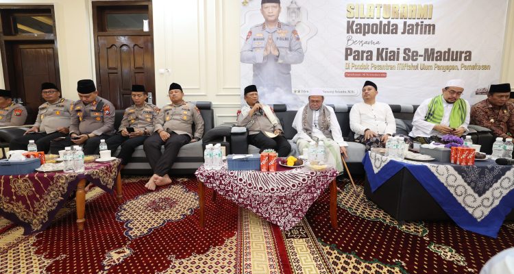 BANGKALAN, Cakrawalajatim.news – Kapolda Jawa Timur Irjen Pol. Drs. Nanang Avianto, M.Si., didampingi para pejabat utama Polda Jatim dan Kapolres Bangkalan AKBP Hendro Sukmono serta Kapolres Sampang Hartono, melaksanakan silaturahmi dengan para kiai, alim ulama, habaib, dan pimpinan pondok pesantren se-Madura di Pondok Pesantren Sembilangan, Bangkalan. Kamis, (6/11/2025).